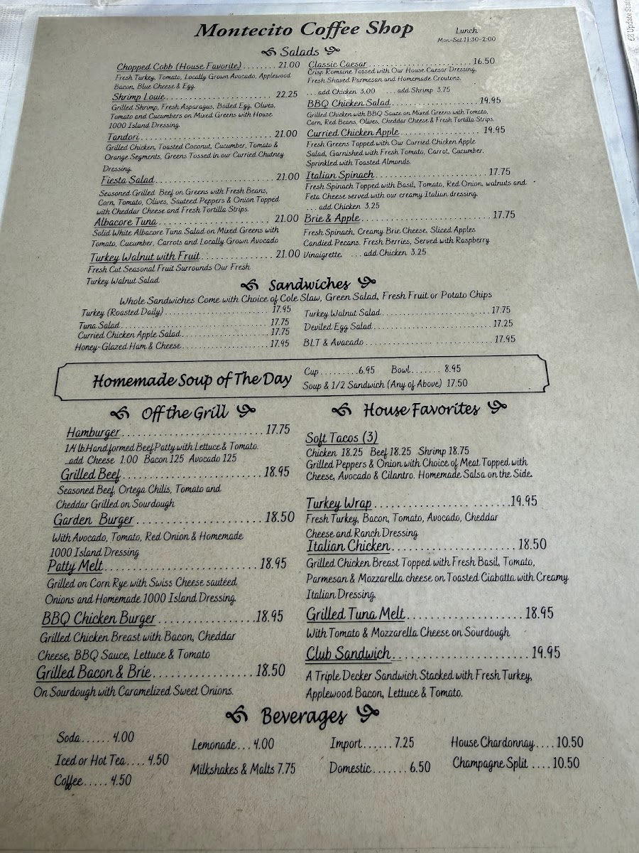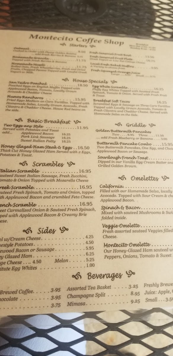The menu at Montecito Coffee Shop offers a delightful range of breakfast and brunch options that cater to a variety of tastes. For those seeking something hearty, the San Ysidro Poached, Huevos Rancheros, and Egg White Scramble Breakfast Soft Tacos provide bold, satisfying flavors. The Basic Breakfast options, including Two Eggs Any Style and Honey Glazed Ham Steak & Eggs ($16.95), are perfect for a classic start to the day. Scramble lovers will enjoy choices like the Italian Scramble, Greek Scramble, and French Scramble, while sides such as a Bagel W/Cream Cheese, Homestyle Potatoes, and Applewood Bacon enhance any meal. For something lighter, the Oatmeal, Homemade Granola, or Fresh Seasonal Fruit Bowl are refreshing picks. Beverages range from Fresh Brewed Coffee to Champagne Split and Mimosa for a bubbly brunch. If you're craving a sweet bite, try the Golden Buttermilk Pancakes, Buttermilk Pancake Combo, or Sourdough French Toast. The California Omelette, Spinach & Bacon Omelette, and Montecito Omelette make for a flavorful egg-based option, while the Turkey, Tuna Salad, and Honey-Glazed Ham & Cheese sandwiches provide savory choices for lunch. For a wholesome treat, the Fresh Seasonal Fruit Plate is the perfect refreshing end to your meal.